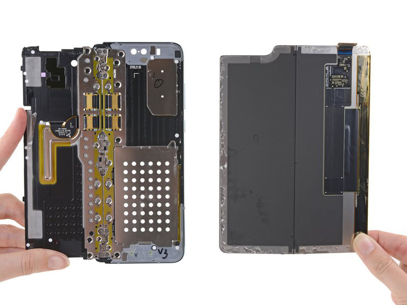 標準的電路板或相機等零件大家未必有興趣知更多,iFixit發現摺得的螢幕的保護性不足可能更引起大家留意。iFixit發現機上的粗黑邊很容易脫落,造成不必要的空隙,令外物容易進入機身,令螢幕受損。而改用膠做螢幕後,本來無咁易跌爛,但這幾天各大外國傳媒測試後,發覺刮花的機會率更高。