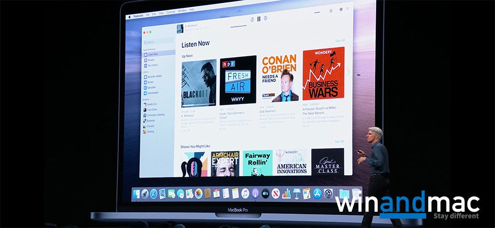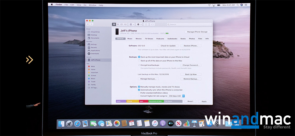 蘋果在台上提到iTunes究竟能否做得更多,然後提到iTunes正式講再見,於Catalina將會是三個不同的apps,包括音樂、Podcast和TV。用家日後接駁蘋果裝置後,不會看到任何東西彈出,只要在Finder就能找到有關介面。