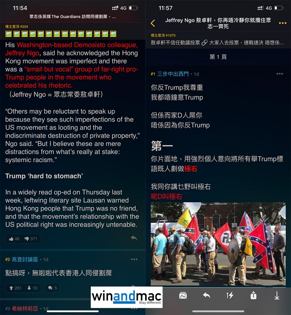 眾志常委敖卓軒早前接受英國衛報The Guardian訪問,提到香港有少部份但有名氣的人,為far-right pro-Trump的人,引發連登仔不滿。連登仔認為敖卓軒代表香港人與美國總統特朗普(侵侵)割席,又把所有舉侵侵標語的人定為極右。事後有連登仔更出盡力狂罵,並指「你可以係美國同大人物講野、受訪,唔係因為你勁,係因為我地交左個責任比你」。