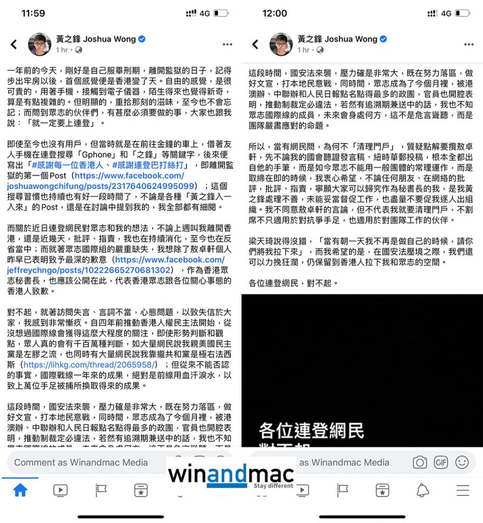 黃之鋒一直沒有回應,但在數小時前發表長文,向連登網民道歉。他指就著訪問失言、言詞不當,心態問題,以致失信於大家,感到非常慚疚。黃之鋒稱除了敖卓軒個人昨早已表明致予最深的歉意,作為香港眾志秘書長,也應該公開在此,代表香港眾志跟各位關心事態的香港人致歉。對於會否踢走敖卓軒,黃之鋒稱國會聽證發言稿、紐時華郵投稿,根本全都出自他的手筆,並說「我不同意敖卓軒的言論,但不代表我就要清理門戶,不割席不只適用於對抗爭手足,也適用於對團隊工作的伙伴。」。