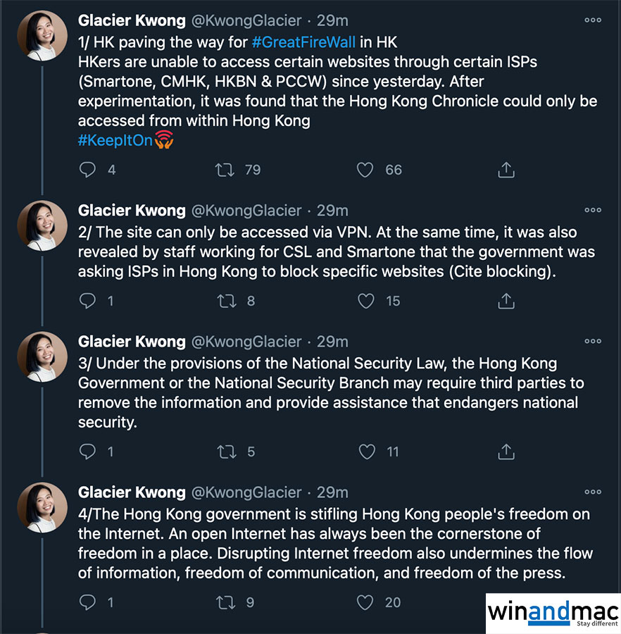 陳妍茵續指,就現時的跡象及證據,有理由相信香港的網絡供應商主動封鎖本站內容,而當中或涉及政府部門的要求或合作。流亡德國的鍵盤戰線前發言人鄺頌晴則在Twitter發表文章,經實驗後發現只能透過VPN才能在香港境內瀏覽香港編年史https://hkchronicles.com/。 同時,她亦收到在CSL和Smartone工作的員工透露,政府正要求香港ISP封鎖特定網站Cite blocking。鄺頌晴提到國安法下,香港政府或國安處可要第三方移除危害國家安全的信息。鄺頌晴其後刪除有關文章,但只是因為目前網站無法瀏覽原因未明,她仍堅持指有ISP員工收到特區政府要求。