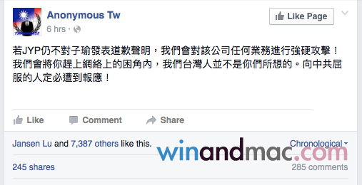 JYP旗下的韓國女子團體TWICE,團員之一的台灣女孩周子瑜因早前在節目上展現台灣國旗,被藝人黃安舉報為台獨份子,大陸憤青聲言抵制。JYP娛樂公司曾多次發出聲明,表示周子瑜本人堅決支持和尊重一個中國原則,可是大陸憤青唔聽。今次,JYP拍攝影片,臉色瘡白的周子瑜讀出道歉信。