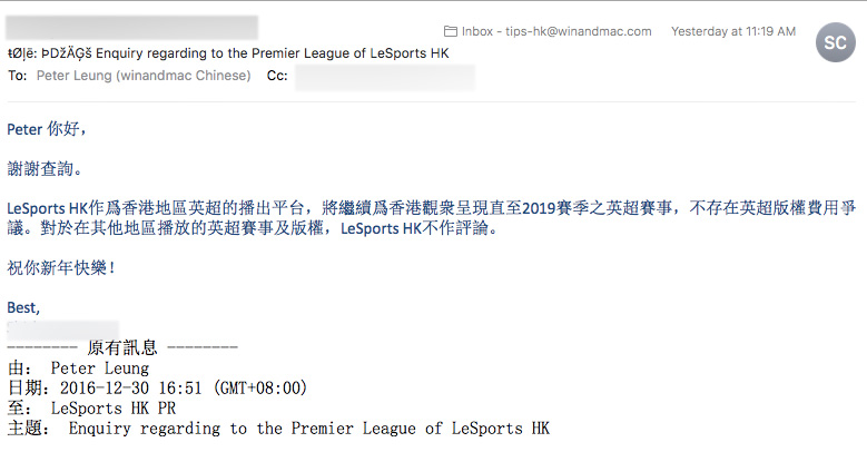 早前有線新聞報道,稱樂視因欠新英體育版權費,目前所交的暫時的費用,僅足夠讓他們播放至1月3日。有不少現有香港用家擔心,1月3日後會否再出現中斷播放的情況。winandmac Media向樂視香港查詢時,他們再次強調將播放至2019年的英超賽事,屆時不會受到影響。