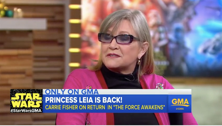 其公關Simon Halls證實有關消息,稱大家在這個時間都感到十分傷痛。Carrie Fisher在1956年於美國洛杉磯出生,為男歌手Eddie Fisher及女演員Debbie Reynolds的女兒,除了為人所熟識的星球大戰外,她也參與了多套電影,包括The Blues Brothers、When Harry Met Sally、Hannah and Her Sisters等,於去年的星球大戰續集中,她也有演出。