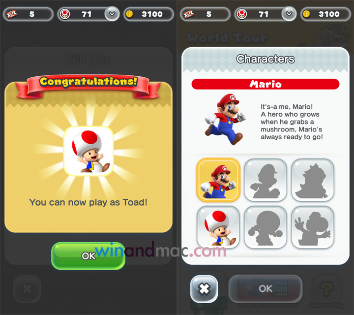 建立戶口的過程不算是複雜,可以透過Facebook、Google或Twitter快速建立即可。完成後再按指示完成連結便可,理論上可以進入My Nintendo畫面,選擇購買Toad的新角色。這樣,日後玩遊戲的時候,每一次進入關卡,按右下方的Super Mario,就可如上圖揀選Toad了。