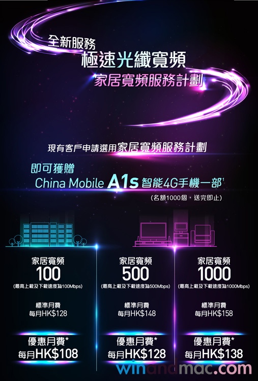 另外,首1000名中國移動香港月費計劃用家,申請家居寬頻服務計劃並成功啟用,可以有China Mobile A1s智能4G手機一部。但要留意只適用於選用家居寬頻100、500或1000服務計劃,簽訂24個月合約並於2017年3月31日或之前成功啟用,優惠期由即日起至2017年2月28日,送完即止。