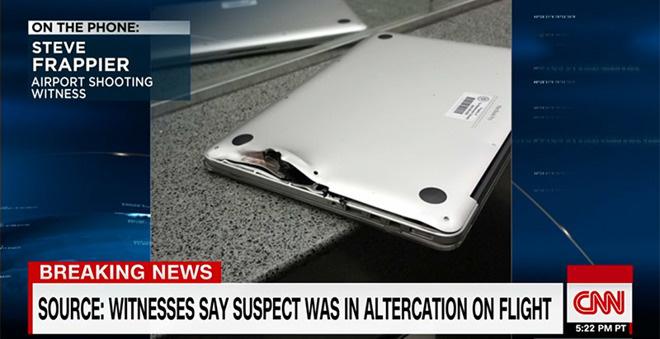 佛羅里達機場於上週五發生槍擊案,造成五人死亡和八人受傷。目擊者之一Steve Frappier在接受CNN訪問時,稱當時知道有人從他後面開槍。原本他以為受傷,但背包中的MacBook Pro救他一命。