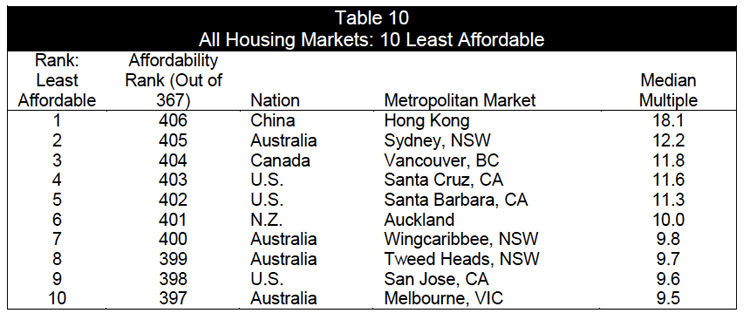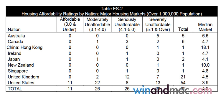 香港排第一位的樓價入息比率為18.1倍,比起第二位的澳洲悉尼12.1倍更慘情,簡單一點來說,香港人最少要不吃不住18年,才有機會置業。美國加州近年亦有不少人投訴樓價昂貴,但在今次排名中的加州城市Santa Cruz僅排第四位,而大家熟識的加州聖荷西為第九位。調查中顯示,香港的樓價並無預期中大跌,仍然相當難以負擔。
