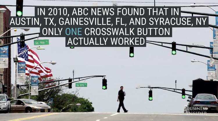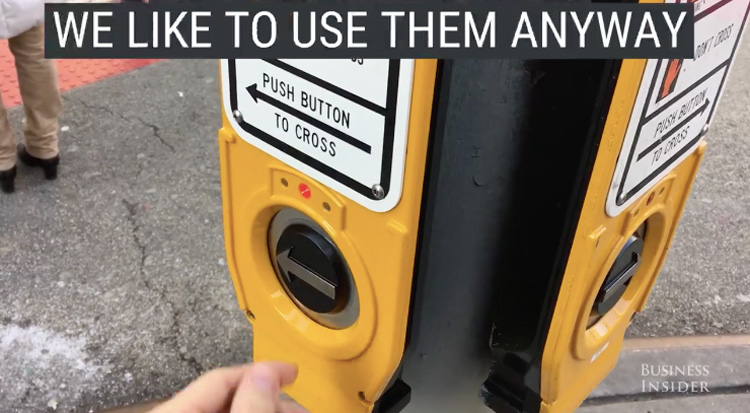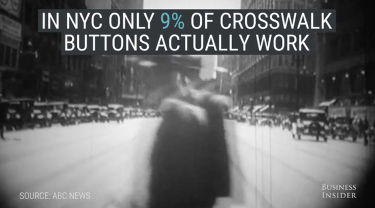影片報道指,在美國紐約市,僅9%的交通燈掣是真的。於2010年時,當地美國ABC新聞更進行測試,發現德州等多個地方,僅一個交通燈掣是真的能正常運作。原因之一,是因為目前大部份城市的交通燈控制已自動化,無需再用人手,故此相關的交通掣亦不會再有作用。至於不拆除的原因,或多或少就真的是為了滿足大家心理吧。