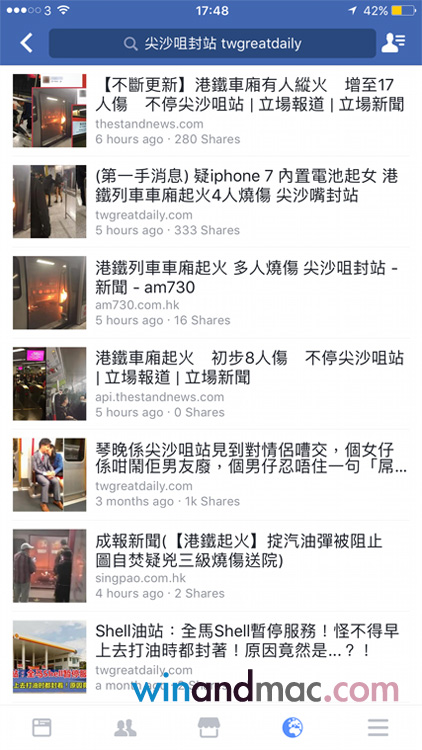 我們發現,有內容農場竟然用上「第一手消息」,以及亂作尖沙咀地鐵著火是因為iPhone爆炸而成。雖然是用上「疑」一字,但明顯大部份網見到熱門關鍵字「iPhone」,就不停地分享明知是內容農場twgreatdaily的連結。離譜的是,Facebook不單沒有好好阻隔假新聞,我們嘗試用不同關鍵字找相關新聞,在文章刊登時,都排更前。