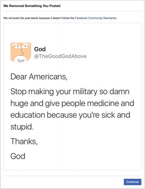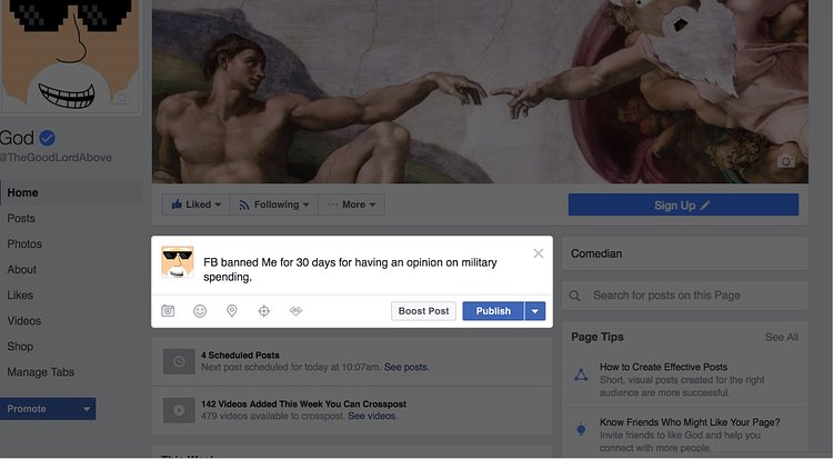 例如當時上帝專頁曾稱,美國人不要再花太多錢去做軍事武器,應該花多一點錢去醫療,結果卻被Facebook封鎖。God專頁最新文章指,最近一次加拿大最近一次的槍擊案中,槍手並不是穆斯林的人,但Donald Trump支持者卻堅持,God清楚指出後令他們不滿。