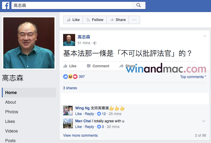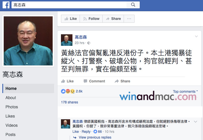 他昨天還引述其報道,「律師黃國桐指,高志森所言未有構成藐視法庭,但就絕對係侮辱法律。」,高志森稱「黃國桐,你錯了,我非常尊重法律,我只係唔信偏頗嘅法官啫。」。今天則繼續發表偉論,「基本法那一條是「不可以批評法官」的?」。從留言中,可以看到清一式都是支持者,大讚高志森敢言,有不少更一起狂罵法官。