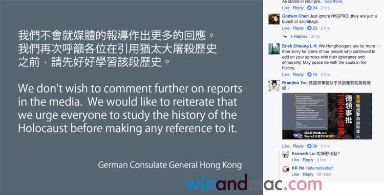 德國領事同批「不恰當」 香港傳媒電視只討好黃營?」,試圖把自喻為猶太人的責任,推向各大傳媒,再一次用猶太人和納粹作比較。面前這些事情的德國駐港領事館,終於忍不住再爆,希望大家好好學習歷史。