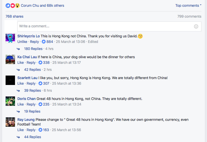 此POST一出,當然引起不少香港網民反彈,寫香港與中國大陸不同。有人更直指,若果香港也是大陸一樣,碧咸的愛犬早就無命。除了香港網民狂Like相關Hong Kong is not China留言外,大陸網民也不甘示弱,狂罵碧咸改POST,可惜獲讚人數似乎不及香港人的留言多。