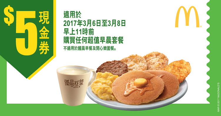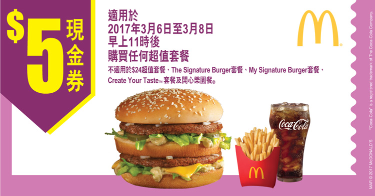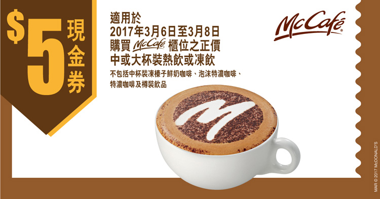 上星期的麥當勞優惠券,讓大家可以慳五蚊,不知道大家又有沒有使用?他們於今天起繼續再加推新的優惠券,由3月6日起至8日,購買指定超值套餐、指定超值早晨套餐或指定McCafé飲品,即可享HK$5折扣優惠。