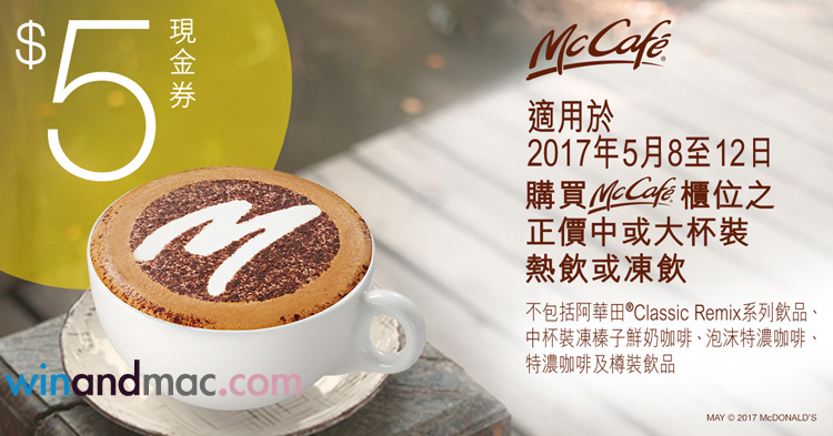 由5月8日至12日期間,於點餐時瀏覽http://campaign.mcdonalds.com.hk/ch/promotions/coupon-offer/170508/,其後向餐廳職員展示電子優惠券,即可享指定優惠。