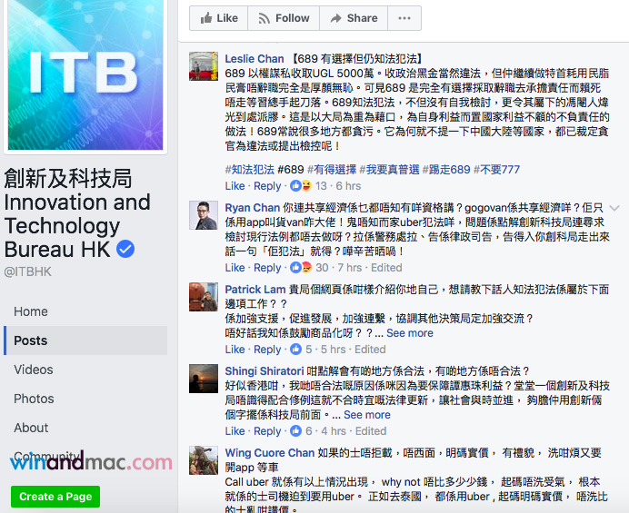 創新及科技局稱Uber有選擇,但知法犯法,兼且用香港人典型性格,與其他國家作比較,稱有些國家也是把Uber裁定犯法。可是,大部份網民都忍夠劣質的士服務,罵番轉頭,還有人稱689有選擇但仍知法犯法。