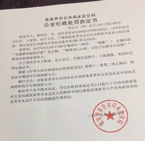 「敬贏」和一班同學在張家界地區,原本他們在群組中已經十分大膽,討論劉曉波的問題,敬贏突然提到「釋放劉xiao波,習包子還能安心訪港?」。全場突然沒有人敢回應,可是群組中有人玩嘢,把相關對話CAP低並交給公安。該名篤灰人還願意做證人,令「敬贏」慘被公安拘留,被指侮辱國家領導人。