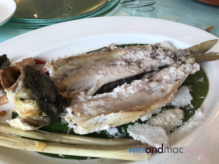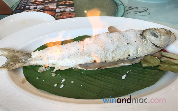 盆燒火焰烏頭魚(HK$188/例)使用不少香料,魚皮上面舖了不少鹽,上菜時會點火,派頭十足。燒過之後的魚味道十分鮮味,入口時會有一點點的鹽味,配合本身的香料,相當不錯。