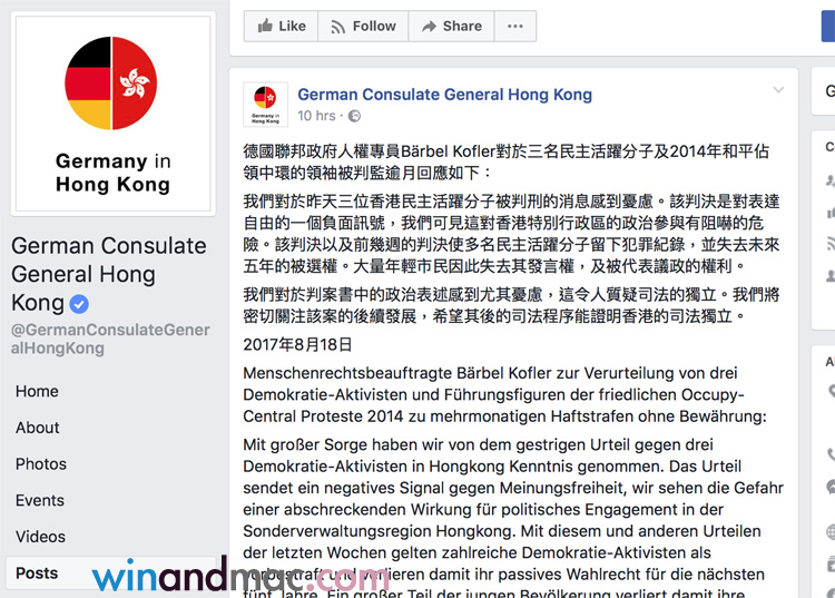 黃之鋒、羅冠聰和周永康最近突然因為就2014年「衝擊公民廣場」案的刑期覆核訴訟,被判監多個月。全球媒體都有報道,不少更直言擔心香港的言論自由,以及大陸政府是否仍然會真的實行一國兩制。一向在Facebook十分直言,常諷刺香港情況的德國駐香港領事館,於數小時前就發表聲明。