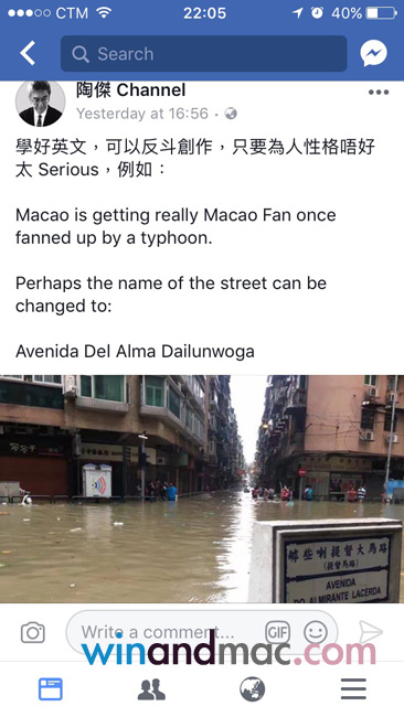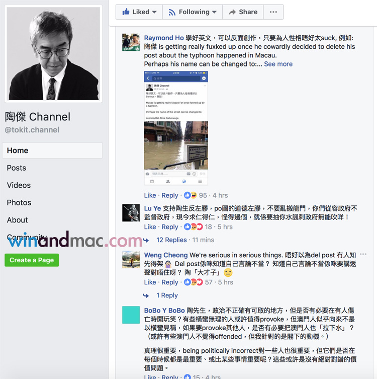 有關圖片還寫道「Macao is getting really Macao Fan once fanned up by a typhoon」,觸怒了不少人。雖然有關原文已被刪除,但似乎網民怒氣未消,在陶傑不少新發佈的文章中,繼續提到有關事件。看來,陶傑真的要認真為其隨意就災難開玩笑的事情,好好向大家道歉了。