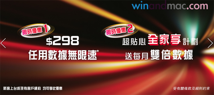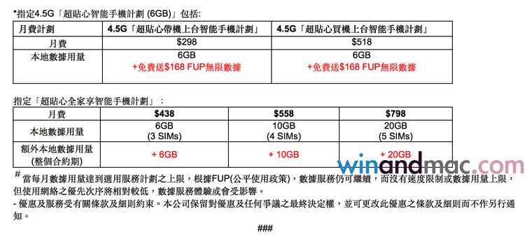 有關優惠為限時,全港所有客戶於SmarTone新登記上台,又或SmarTone現有客戶續約,選用指定4.5G「超貼心智能手機計劃 (6GB)」,即可獲免費「FUP無限數據」優惠,於整個合約期內盡情享用數據。簡單一點來說,即是最便宜可以做到HK$298,就能無限上網。