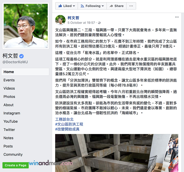 台北市長柯文哲早前解決了鉛水問題,他稱無助選票但要做的都要做,令不少香港人羨慕。近日,他又再宣佈再有一項無助選票的政績,就是解決台北市文山區的水浸問題。