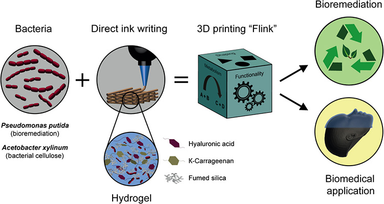這款生物打印墨水的全名為「多功能活性墨水」,又名 “Flink”,是由蘇黎世聯邦理工學院 André Studart 教授和他的團隊研發。它是一種含多種細菌和營養物質的水凝膠 (hydrogel),能搭載不同類型的細菌。科學家可透過加入活生生的細菌,生產出具不同功效的生物材料和藥物。
