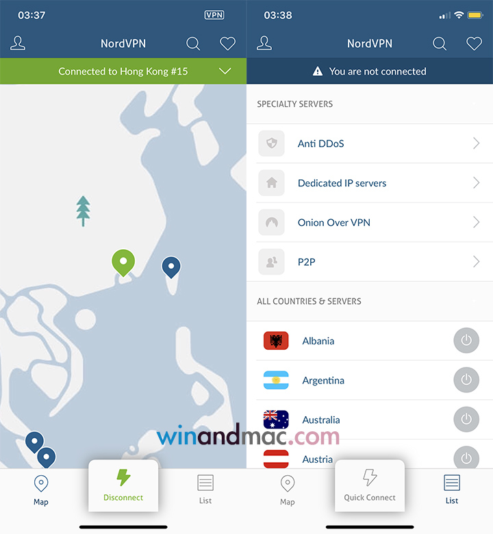 大家可以從上圖左可以看到,NordVPN的特色之一就是伺服器選擇真的很多,而且速度也算是不錯。我們在測試中,就算使用一些影音播放程式,連接至其他的VPN不時都因為IP問題被封鎖,但連接至NordVPN後則沒有此問題,讓大家可以隨意看到不同地區的內容。而就算在大陸,一旦無情情被封,NordVPN也有極多伺服器讓大家嘗試。