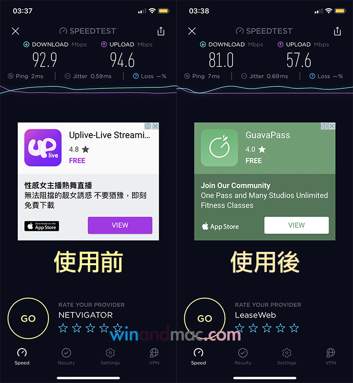 很多人都認為,加上VPN後上網速度會變慢。事實上,很多VPN服務的伺服器速度都很快,再加上香港上網本身速度就夠快,加VPN後會變慢極多的情況已甚少發生。像我們今次測試的NordVPN,隨機連接至其相關的香港伺服器,大家可以看到使用前後的速度分別不大。