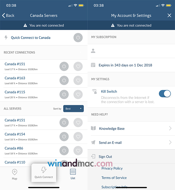 當然,他們也有相關iOS和Android apps下載。下載後只要輸入登入名稱和密碼,然後和桌面版一樣,在地圖揀選想連接的地區即可。又或按Country List,如上圖右般選擇不同國家或地區的伺服器,又或想要的特別連接服務便可。
