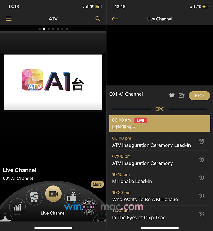 大家從Live Channel部份,就可以看到有關頻道,目前已經開始試播中,主要是一些宣傳片和不同客戶支持的片段。部份時間也可以看到一些財經節目。據亞洲電視向winandmac Media表示,初時啟播的節目將接近24小時。大家由今晚6點起,就可以睇到開台禮和不同的節目,於晚上10.30更會有陳志雲主持的百萬富翁。
