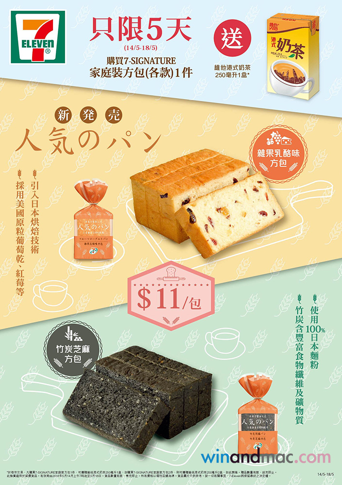 由5月14日起至5月18日,買7-SIGNATURE 4片裝家庭裝方包(各款)1件,即免費送維他港式奶茶(250毫升)1盒。當中有兩款選擇,包括7-SIGNATURE 雜果乳酪味方包(HK$11)及竹炭芝麻方包(HK$11),前者口味香甜,配上粒粒美國原粒葡萄乾同紅莓,後者竹炭芝麻方包則含豐富食物纖維及礦物質。