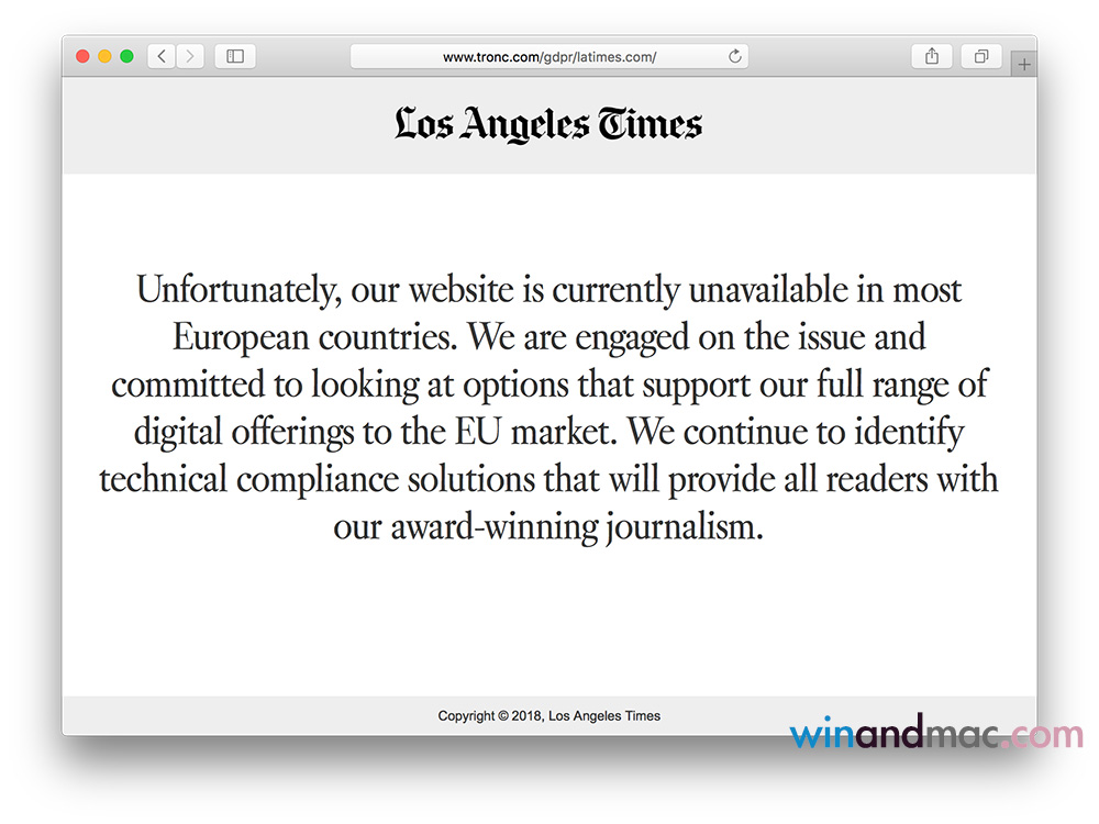 GDPR的條文和要求其實頗多,很多公司都趕不及在25號的限期,更改網站避免拿取過多用戶資料,故此不少都決定暫時身處封鎖歐盟國家的用戶,瀏覽或使用有關網站。winandmac Media發現,LA Times、New York Daily Times、Chicago Tribune等美國網站,若身處在英國或歐盟國家可能會看到上述提示,完全無法瀏覽有關內容。據報道指,有關網站為了避免因違犯GDPR付可能高達數十億罰款,才會暫停向有關地區用戶提供服務。