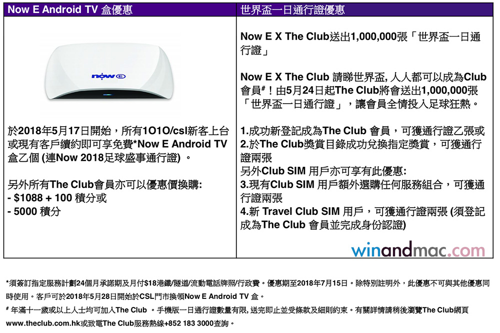 標題所提到的100萬張世界盃一日通行證,派發方式有多種,未成為The Club的用戶新登記就會有得送,已經是The Club用戶則可參考上述不同方法,以便換取一日通行證。若是新上台或續約的csl客戶,有更多優惠。留意上述優惠受條款約束。