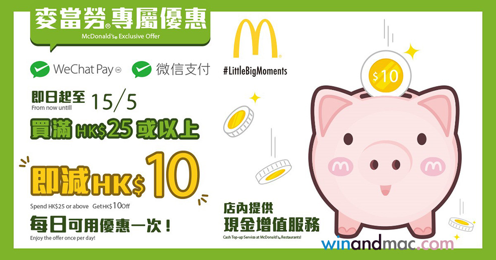 由即日起至5月15日期間,用戶在香港麥當勞餐廳惠顧任何食品滿HK$25或以上,並以WeChat Pay HK付款即減HK$10,推廣期內每位用戶每天最多可享優惠一次。留意此優惠不適用於沙田馬場及跑馬地馬場之香港麥當勞餐廳。