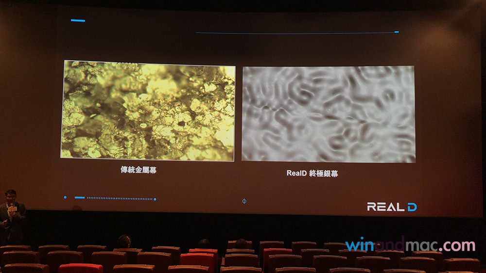 RealD螢幕上的微孔也較傳統的細,我們走近拍攝時便可清楚看到(上圖),故此能達到更佳的電影體驗。最重要的,是這裏的RealD影院,其字幕也不會有任何鬼影,小編實際試睇的時候,可看到字體相當實淨清晰。正如剛才所説,在這裏睇3D電影,應可減少因鬼影導致不舒適的問題。