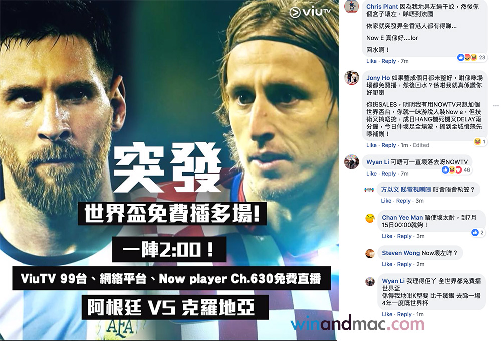 有不少網民都有在nowTV旗下的Facebook留言表示憤怒,然而今晚出事後,now E沒有向傳媒作任何回應,反而奇怪地加多一場免費場,於本文章發表稍後的2:00am,直播阿根廷對克羅地亞。雖然反應算快,但明顯這沒法補償已付費的now E用戶。難怪有關文章一出,不少有俾錢買now E的用戶即時嬲爆。
