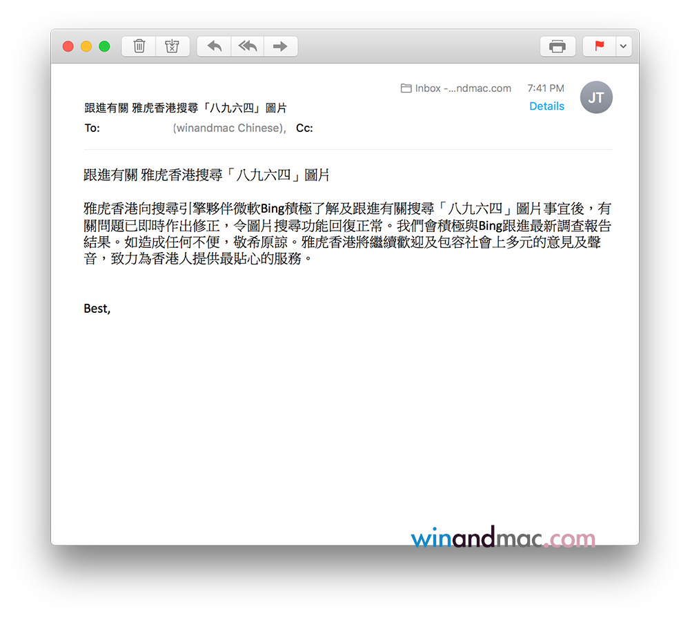 雖然winandmac Media僅向原本提供技術的微軟香港查詢,但Yahoo香港公關直接向本網站編輯發出電郵,強調他們「歡迎及包容社會上多元的意見及聲音,致力為香港人提供最貼心的服務。」,並指已向Bing了解,有關搜尋功能已回覆正常。