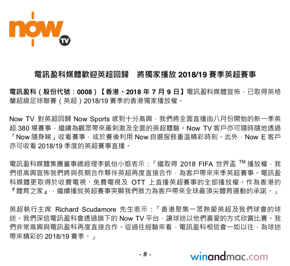 今次的播放權包括收費電視、免費電視以及網絡OTT平台,亦即是説,除了本身Now TV和Now Player app外,官方更表明早前推出的Now E,也可以睇到2018/19英超。