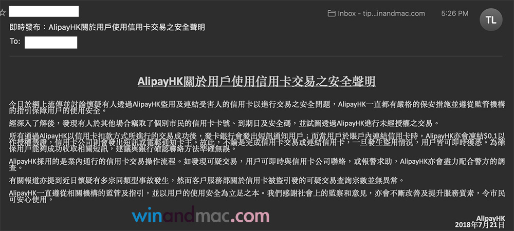 經深入了解後,發現有人於其他場合竊取了個別市民的信用卡卡號、到期日及安全碼,並試圖透過AlipayHK進行未經授權之交易。