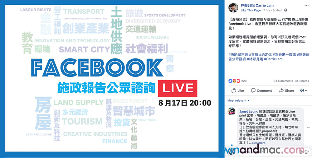 今次Facebook Live主要是為了施政報告,官方Fan Page表示:「如果嗰晚唔得閒都唔緊要,你可以預先喺呢個Post度留言,當晚除咗即場交流,我都會抽部分留言出嚟回應!」。目前留言的數量僅64個,未知是不是香港人真的不再關心政治,抑或是部份留言被刪除。怎樣也好,若你想爭取機會向林鄭説出意見,就不要錯失機會按此留言。