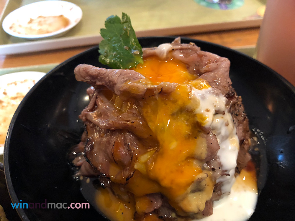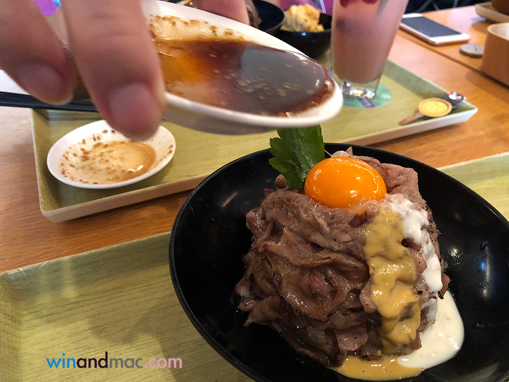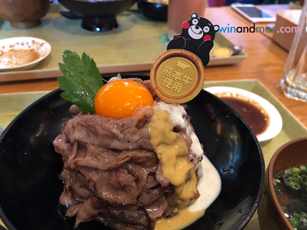 其食法相當簡單,有關丼物會有熊本直送的熊本燒牛肉汁,大家開始吃之前,把牛肉汁倒進去,然後再弄破蛋黃,把其攪伴好就可以進食。小編在場試食時,發現底部會有一些芥茉醬,所以真心建議攪伴好一點。