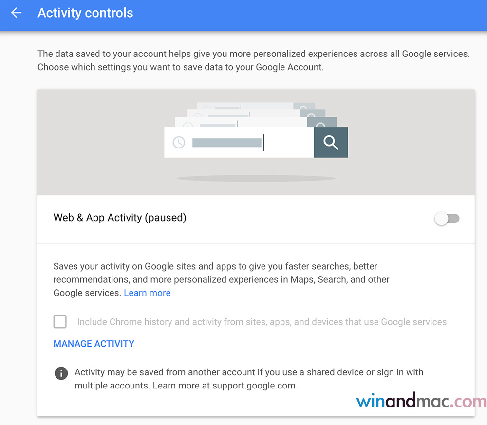那麼用家應如何解決?方法先登入Google戶口,按Personal Info & Privacy,再按My Activity。進入My Activity後,再按Activity Controls,只要按上面的Web & App Activity,也如上圖一樣把其關閉即可。留意有關功能關閉後,搜尋時或使用Google服務時,其建議和速度可能會減慢。