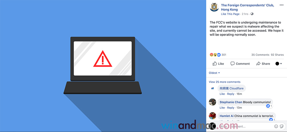 官方的香港外國記者協會在Facebook發出通告,稱他們發現網站有惡意程式,目前正在搶修中,他們希望能盡快恢復提供服務。雖然FCC沒有表明為什麼突然有惡意程式,但不少網民都認為與今天陳浩天演講有關。