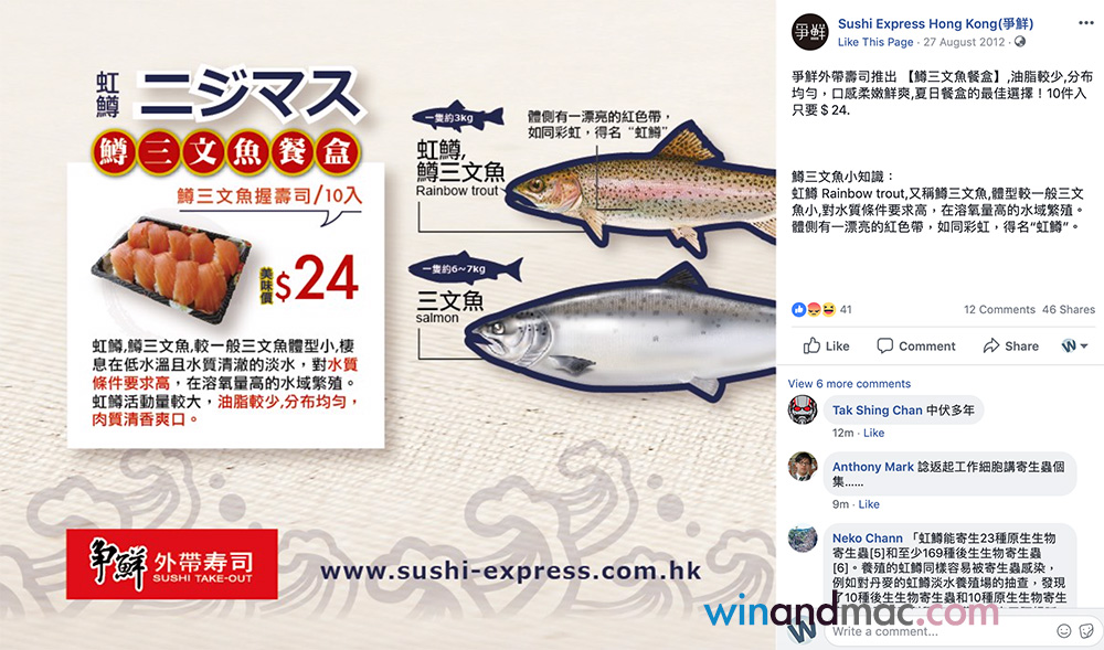 大陸近日因為重新定義三文魚,把虹鱒當成其中之一,引發不少人討論。今天有眼利的網民發現,其實香港著名兼經常排長龍的壽司店爭鮮,其實早在2012年就有賣虹鱒三文魚。