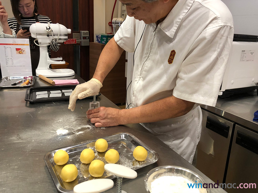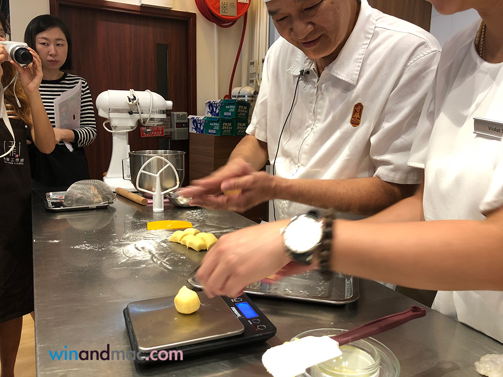 若果要製作像Lady M那款傳統月餅,比小丸子細細個的奶黃月餅就更難。試想想要把上圖右方的東西,包在左方的皮中,少一點經驗也無法做好。winandmac小編嘗試親身製作時,試了好幾次仍然有難度,連師傅都唔知點幫和教。