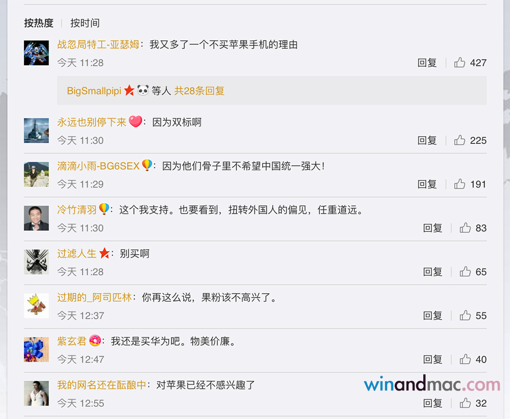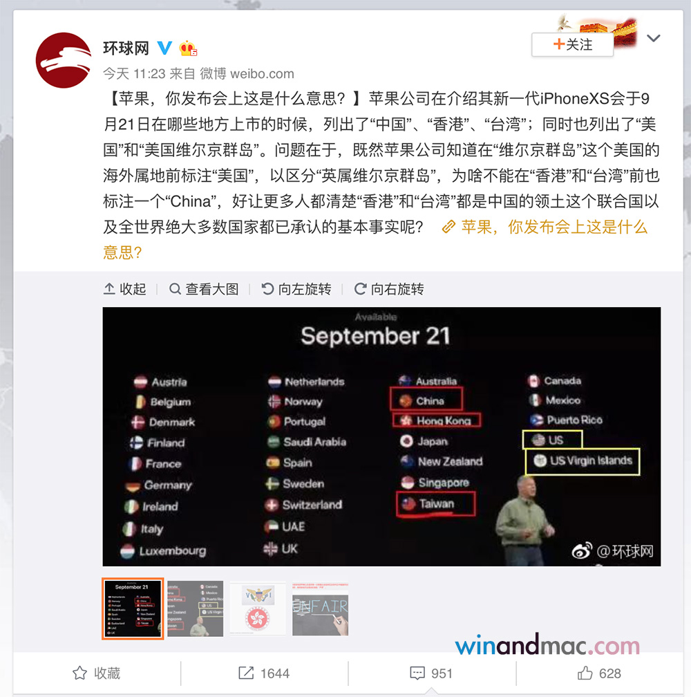 大陸環球網率先在微博發表文章,以維爾京群島為例子,稱蘋果在前面都加上「美國」作區分。環球網認為香港和台灣前面都應該加上中國才對,又稱台灣和香港是中國一部份是基本事實。大陸網民當然也同時玻璃心一齊破碎,稱「多了一個不買蘋果手機的理由」、「骨子裏不想中國統一強大」、「我還是買華為吧」等。