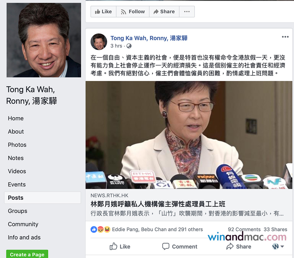 近年來力挺特首和黨的湯家驊,在今早颱風過後,又再次出post發功。在香港人擔心僱主不體諒的時候,他絕對信心,僱主們會體恤僱員的困難。