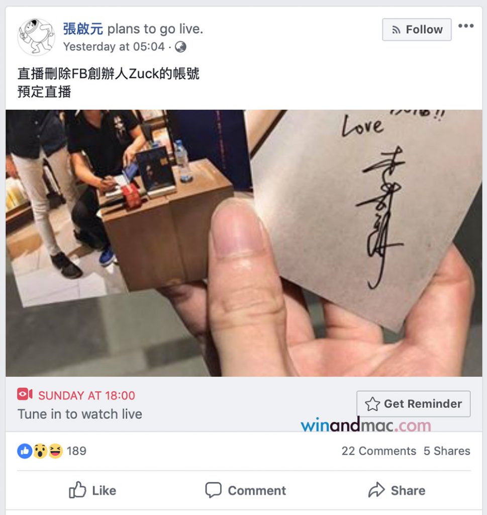 台灣白帽黑客張啟元,曾經在較早前成功刪除不屬於自己的Facebook戶口,引起不少人報道。後來,他再聲稱以一元買蘋果產品,但卻被人質疑。數小時前,他聲稱再發現Facebook漏洞,仍然可以刪除任何Facebook戶口。他更設定將於今星期日直播,還串嘴地聲明會刪除Facebook創辦人Mark Zuckerberg的戶口。